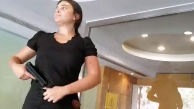 На кадрах видео женщина достает пистолет в помещении банка, что вызвало у посетителей панику. Вместе с женщиной в банк пришел мужчина в желтой футболке, который запер вход в финансовое учреждение на цепь. Неизвестно, является ли он сообщником или одним из заложников, действующим по требованию женщины.