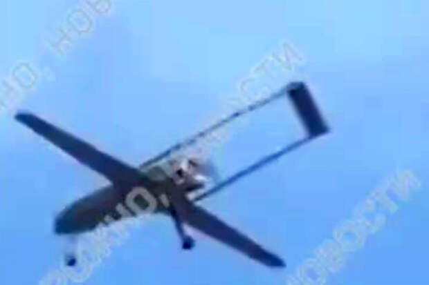 На ролике, снятом местными жителями, можно увидеть в небе белый беспилотник самолетного типа и услышать его жужжание.