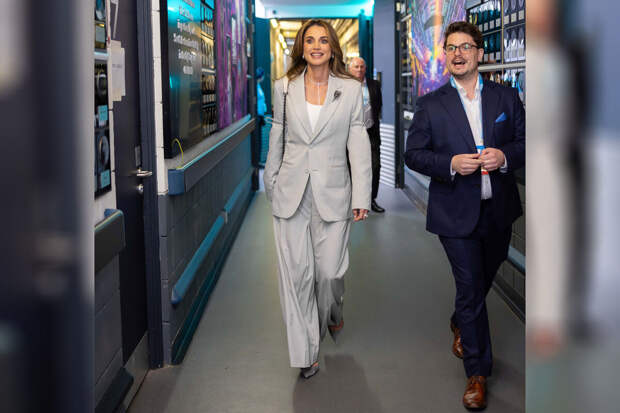 53-летняя королева Иордании Рания аль-Абдулла появилась на всемирном форуме молодежи One Young World в Ирландии. Для выхода на публику она предпочла серый костюм из мужской коллекции французского бренда Dior, состоящий из пиджака и прямых брюк.