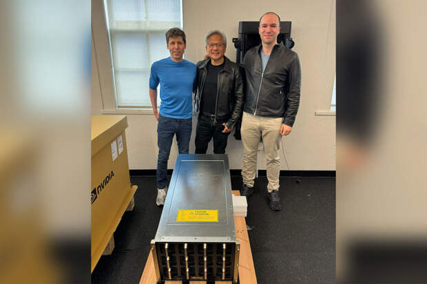 Брокман также поделился фотографией себя, генерального директора OpenAI Сэма Альтмана и Хуанга вместе с ускорителем H200.