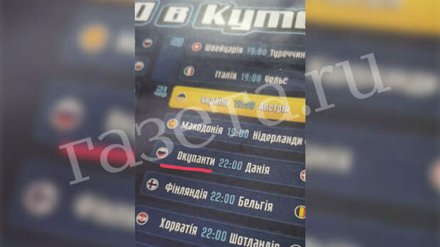 В одном из киевском баров на афише матчей, которые будут показываться в заведении, сборную Россию на табло обозначили словом "Оккупанты". Об этом сообщает корреспондент "Газеты.Ru".