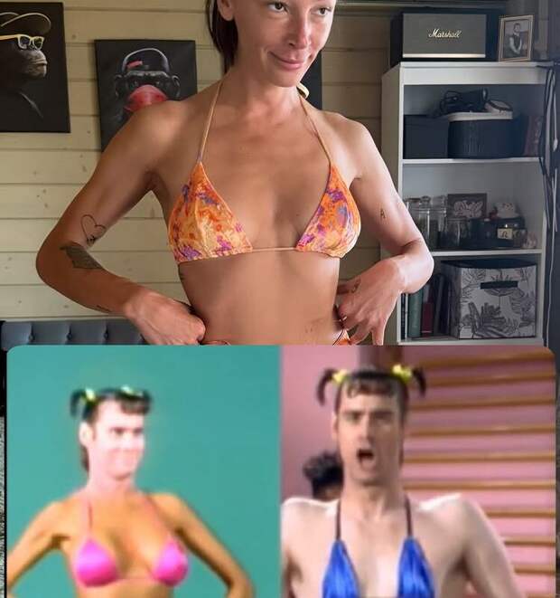 Анастасия Ивлеева была запечатлена в оранжевом крошечном бикини с розовым вкраплением. Блогерша собрала волосы в хвосты и отказалась от макияжа. Знаменитость повторила образ голливудского актера Джима Керри в купальнике.