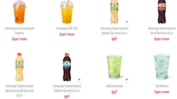При этом традиционные для сети напитки брендов Pepsico: 7Up, 7Up Мохито, Pepsi, Mirinda,отсутствуют. Рядом с ними находится отметка "будет позже".