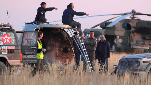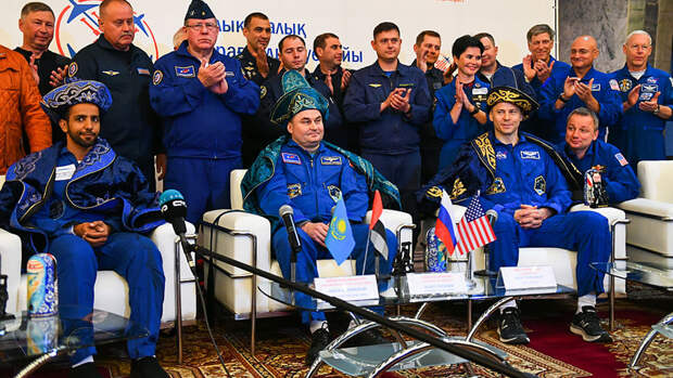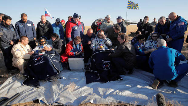 В свою очередь Овчинин и Хейг провели в космосе по 203 дня.После приземления члены экипажа приняли участие в пресс-конференции в аэропорту Караганды, где каждому из космонавтов надели на голову национальный головной убор и вручили по матрешке.