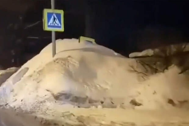 Один из них расположен рядом с нерегулируемым пешеходным переходом. В этом сугробе пробита пещера для прохода людей, сама куча снега при этом достигает дорожных знаков.Вход в снежную пещеру сделан сбоку, со стороны тротуара, выход - на проезжую часть, к самой "зебре". На другой стороне дороги есть небольшой сугроб.