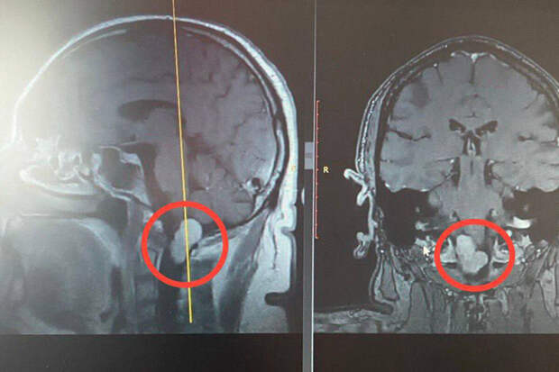 52-летний мужчина пожаловался врачам на звон и жужжание в правом ухе. Они оказались симптомом опухоли мозга, которая проходила между шейными позвонками и вросла в полость черепа.