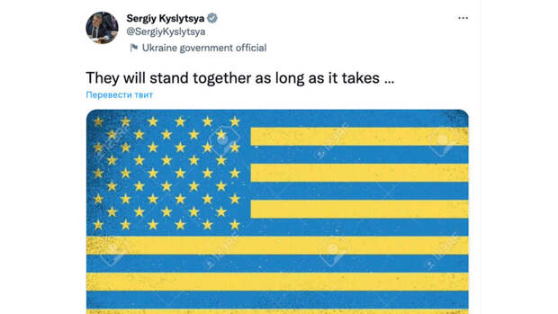 Дипломат опубликовал на своей странице в Twitter флаг США в желто-голубых цветах. Свой пост Кислица сопроводил следующей подписью: "Они будут стоять вместе столько, сколько потребуется".