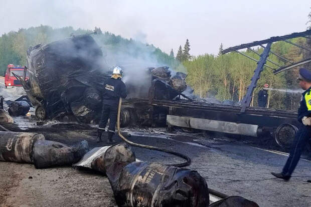 Второй водитель погиб. Личности обоих водителей устанавливаются", - отмечается в сообщении ГИБДД.На видео с последствиями инцидента видно, что большегрузные автомобили выгорели дотла. Около одного из них разбросаны обгоревшие металлические бочки, которые используются в том числе для фасовки смазочных материалов. На месте аварии работают экипажи ДПС. Возгорание ликвидировали прибывшие пожарные.