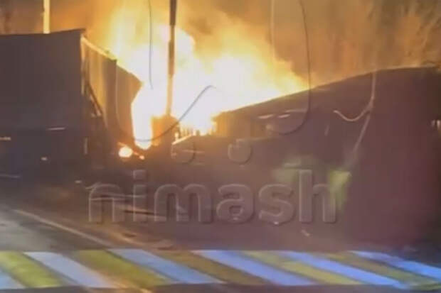 На кадрах с моментом аварии видно, что тягач с полуприцепом на высокой скорости выехал с проезжей части. Машину занесло, спустя несколько секунд вокруг нее вспыхнуло пламя.