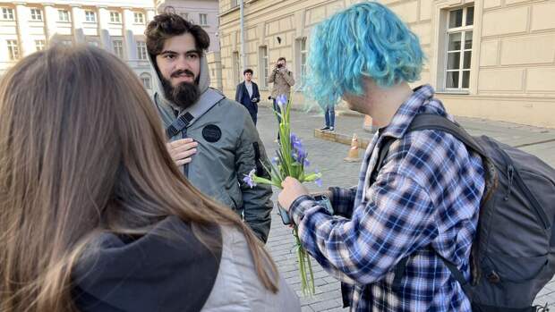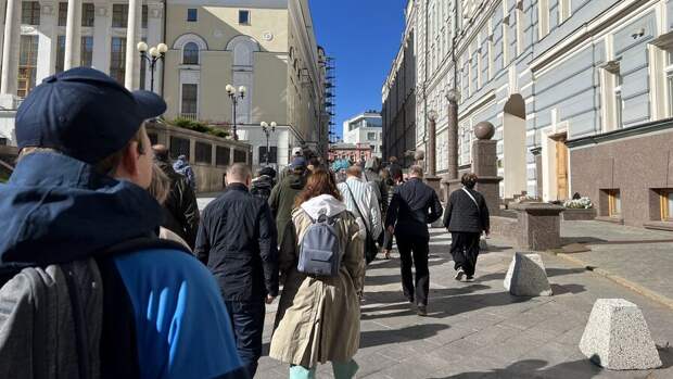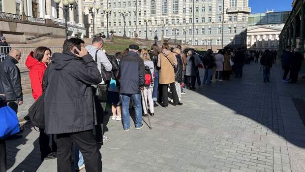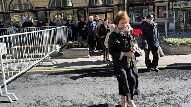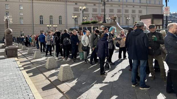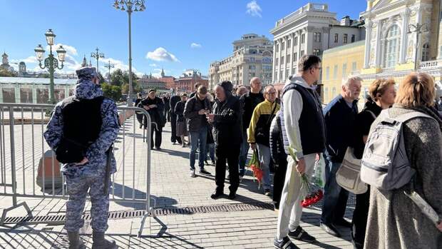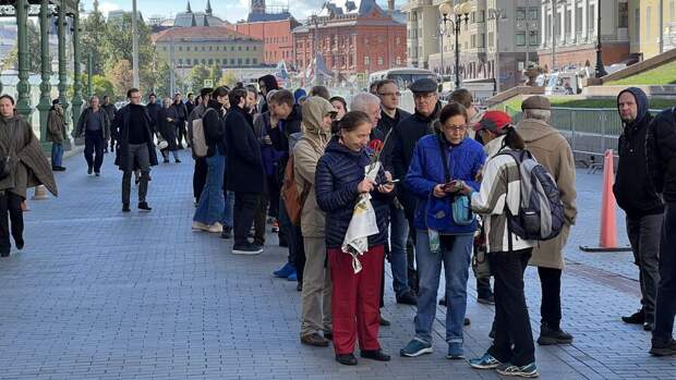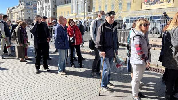 С самого утра люди, желающие отдать дань памяти Горбачеву, стояли в очереди рядом с Большим театром и у Камергерского переулка. Они держали в руках цветы, некоторые надели траурные ленты.