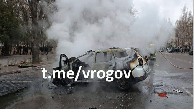 Рогов также опубликовал фото взорвавшегося автомобиля, который почти полностью выгорел.
