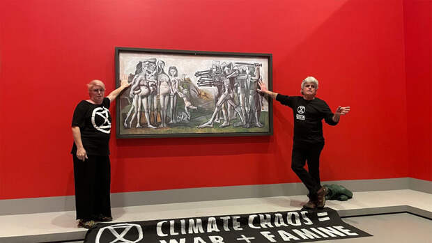 49-летняя женщина и 59-летний мужчина около полутора часов были приклеены к произведению искусства. В результате картина не пострадала."Восстание против вымирания" использует методы ненасильственной борьбы, чтобы привлечь внимание к проблемам изменения климата. Движение было основано в 2018 году в Великобритании.