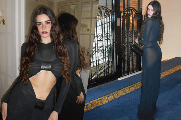 29-летняя Барби Феррейра предстала перед камерой в черном полупрозрачном макси-платье с вырезом спереди, под которое надела стринги. Актриса добавила к образу кожаный клатч в тон.