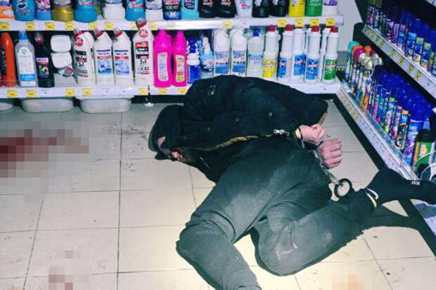 Оставляя следы крови, он проник внутрь и укрылся в отделе бытовой химии. На кадрах с места происшествия видно, что он залил весь пол кровью.Прибывшие на место правоохранители обнаружили злоумышленника на полу - при задержании он пытался нападать на полицейских, угрожал им. Иногда он впадал в состояние просветления и не понимал, где находится.