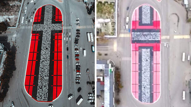 "Я развязал узлы мудрости и освободил сознание краски. Я преодолел невозможное и пропасти сделал своим дыханием. Мы, супрематисты, бросаем вам дорогу", - вписал в работу цитату из манифеста Каземира Малевича Покрас Лампас до того, как ее вогнали в асфальт. Арт-объект с соответствующим названием "Супрематический крест", занимающий площадь в 6,6 тыс. кв. м, появился в начале июля. Художник работал над ним три дня.