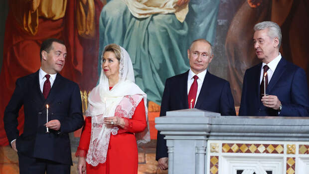 Президент России Владимир Путин посетил пасхальное богослужение в храме Христа Спасителя в Москве, вместе с ним в храм прибыли Дмитрий Медведев с супругой Светланой.