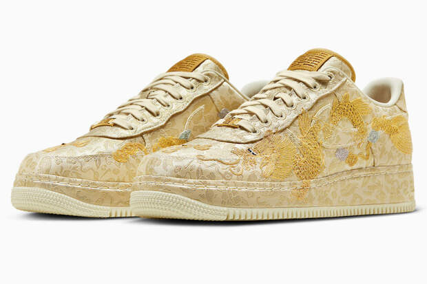 Бренд выпустил эксклюзивную модель Air Force 1 Low с золотым принтом и драконом. Верхняя часть пары кроссовок выполнена из золотистого шелка, расшитого цветочными узорами и логотипами Swoosh.