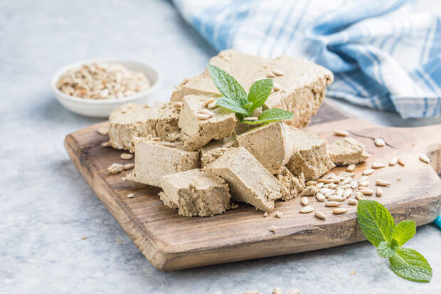 Халву делают из тахини (молотого кунжута), орехов или семян подсолнечника.