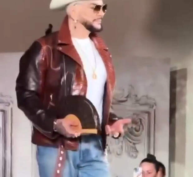 На одном из мероприятий Киркоров вышел в красно-коричневой куртке, солнечных очках, джинсах и молочной ковбойской шляпе. Его образ дополнили золотые украшение, коричневый пояс и черная сумка.