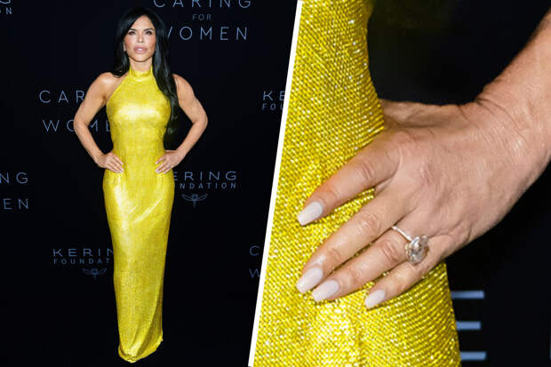 Лорен Санчес выбрала для выхода желтое блестящее платье с открытыми плечами и шлейфом от итальянского модного дома Dolce & Gabbana.Телеведущая отказалась от каких-либо аксессуаров, подчеркнув образ лишь обручальным кольцом с массивным бриллиантом размером более 20 карат. По данным журналистов, стоимость кольца, подаренного Санчес ее возлюбленным, миллиардером Джеффом Безосом, составляет более $2,5 млн.