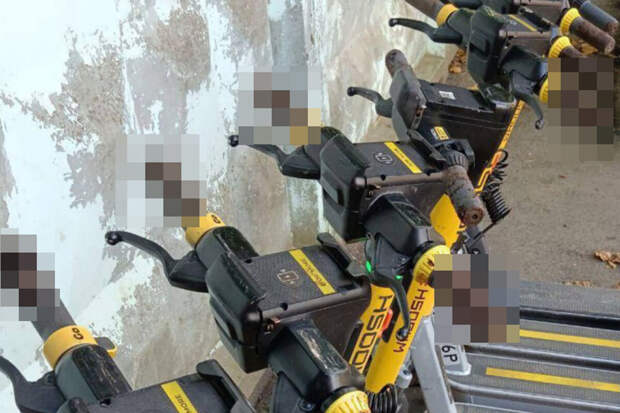 На опубликованных в сети кадрах видно, что ручки у восьми электросамокатов обмазаны фекалиями.