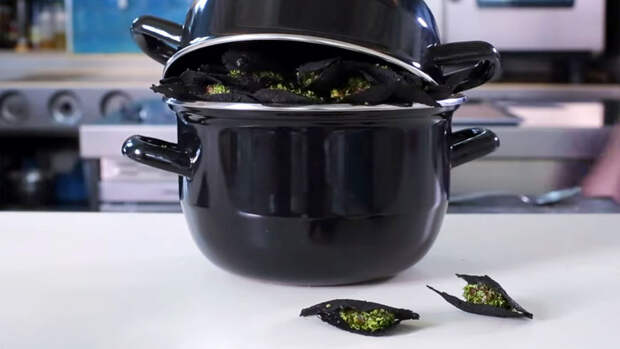 В заключение остается собрать всю конструкцию: в "створку" из нори положить баклажановую "устрицу" и добавить поверх шпинат с чесноком.