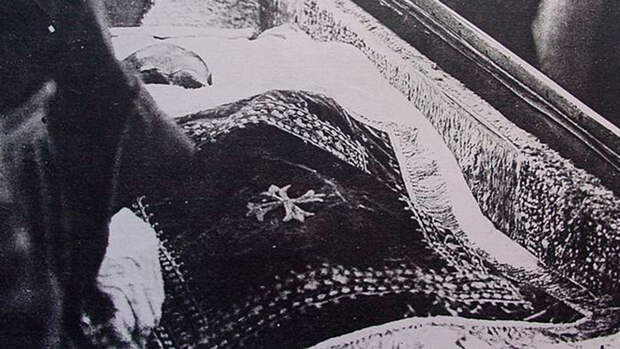 В протоколе вскрытия было зафиксировано: "С головы снимают шапочку, с шеи – бинт фиолетовый, затем голубой. Разрывает иеромонах Иона швы у ног, распарывает ножницами парчовый голубой мешок. Вынул сбоку вату, распарывает швы, фигура становится плоской, толщиной в четыре пальца, снимает распоротый голубой мешок, под которым обнаруживается полуистлевшая ткань серо-коричневого цвета. Снизу лубок. По снятии шапочки с головы виден человеческий череп, лежащий частью на лубке, частью на весу. Возле черепа справа виден первый шейный позвонок. Длина фигуры соответствует человеку среднего роста".