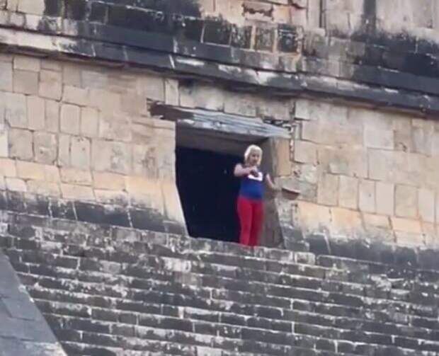 На кадрах видно, как женщина поднялась на на пирамиду Кукулькана в городе майя Чичен-Ица. На одной из ступеней она остановилась и начала танцевать. Туристку задержал охранник и вывел ее к толпе, которая возмущалась ее поведением.