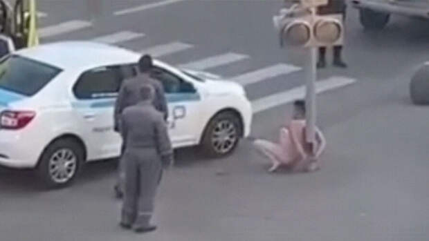 Судя по кадрам, кто-то приковал его наручниками к светофору, предварительно сняв всю одежду. Мужчина сидит на корточках, пытается встать, но это у него не получается.