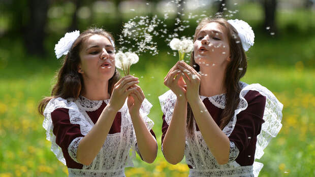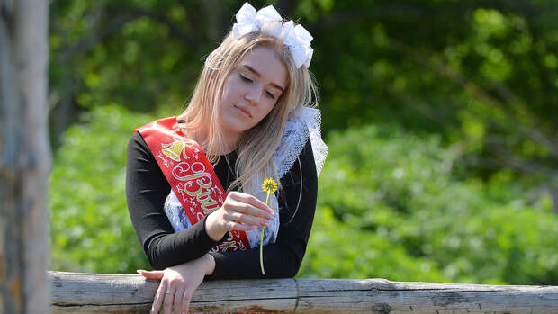 Многие девочки, по сложившейся со времен отмены советской школьной формы традиции, нарядились на свой Последний звонок первоклассницами: белые банты, кружевной передник, темное платье — правда, некоторые в этом году дополнили наряд защитной маской.