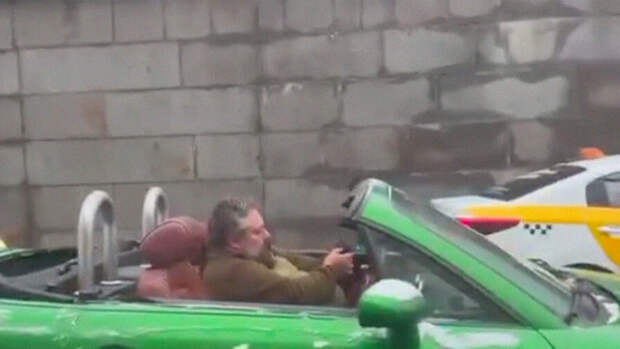 На мужчине нет куртки, но не заметно, что он замерз.Некоторые подписчики предположили, что у владельца зеленого автомобиля сломалась крыша, поэтому он не смог закрыть ее во время ледяного дождя в Москве.