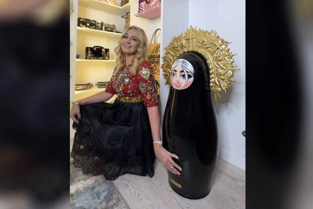 Яна Рудковская купила две матрешки: белую и черную с золотыми кокошниками. Необычный декор она расставила по гардеробной. В кадре она также позировала в платье с красным лифом с золотым принтом и черной пышной юбкой.