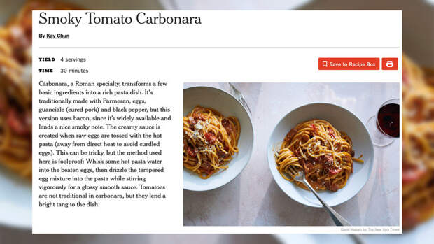 Дело в том, что классическая паста карбонара готовится с яйцами, твердым овечьим сыром пекорино и гуанчале, то есть сыровялеными свиными щеками – однако автор рецепта NYT Кей Чун предложила набор ингредиентов, далекий от оригинального. Для приготовления "томатной карбонары с дымком" читателю потребовались бы бекон вместо гуанчале, поскольку "он широко доступен и придает приятную копченую нотку", томаты, которые как признает автор, традиционно не используются, но "дадут яркую кислинку" и пармезан, который делается из коровьего молока, вместо пекорино, и этот выбор в издании объяснять не стали.