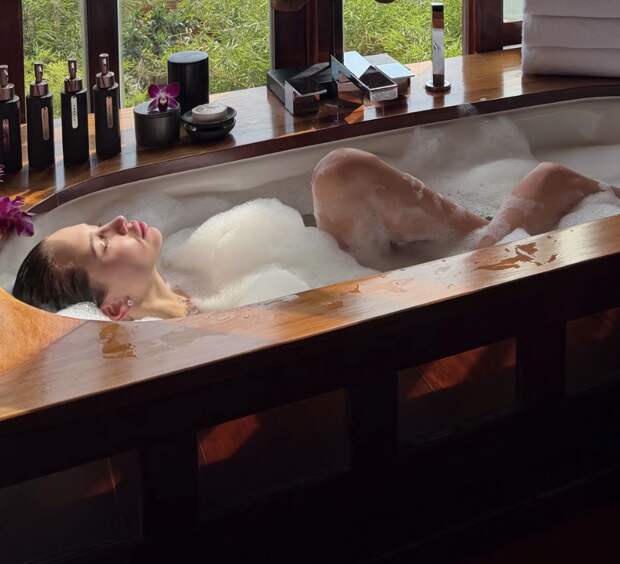 19-летняя Аврора Киба позировала перед камерой без одежды, надев только серьги с бриллиантами. Невеста народного артиста России была запечатлена с распущенными волосами и без макияжа. Девушка принимала ванну с пеной на фоне окна, из которого открывался вид на океан и пальмы.