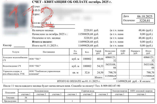 Один из недавних платежных документов оказался неожиданным — в нем указано, что жилье "потребило" около 100 миллионов литров холодной воды. Согласно расчетам, это примерно половина объема Можайского водохранилища. В управляющей компании подтвердили, что разбираются в произошедшем.