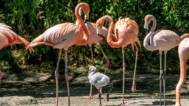 "После того, как птенец вылупился в их гнезде, они сидели с ним две недели, согревая его и защищая от других фламинго", - рассказали в зоопарке.