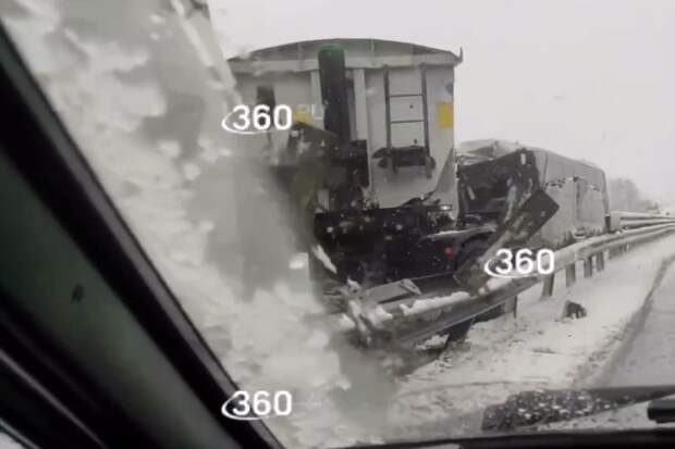 Одну из фур развернуло на дороге, она разбила металлические ограждения разделительной полосы.