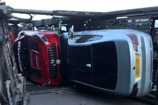 Инцидент произошел в районе гоночной трассы "Брэндс-Хэтч" в графстве Кент. Водитель грузовой машины, который перевозил спорткары, получил легкую травму.