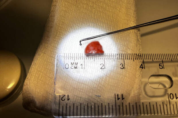 "С помощью эндоскопического крючка камень был аккуратно извлечен. Вся процедура заняла не более пяти минут и прошла без осложнений", - рассказал врач-оториноларинголог Роман Удод.