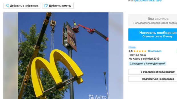 Ранее пользователи сети заметили, что вывески "Макдоналдс" появились в продаже на "Авито". Один из авторов объявлений продает сразу две вывески за 300 тыс. рублей. Он рассказал изданию "Подъем", что готов снизить цену. При этом мужчина не стал уточнять, где висели его буквы, но пообещал раскрыть информацию покупателю.