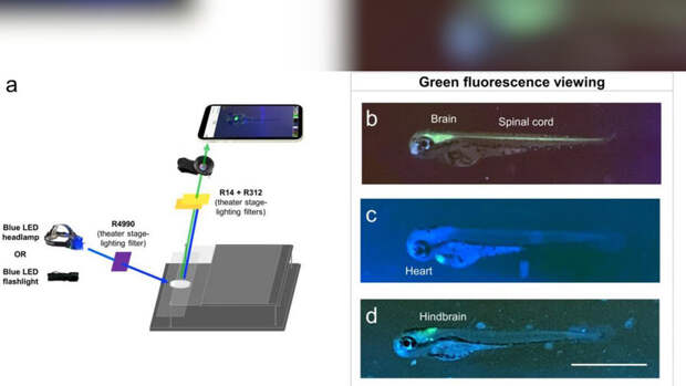 Однако, поскольку эти микроскопы обычно стоят не менее нескольких тысяч долларов США, воспользоваться ими могут лишь сотрудники специализированных лабораторий."Светоскоп", разработанный Джейкобом Хайнсом и его коллегами, состоит из пластиковой рамы, накладного объектива для камеры, светодиодного фонарика и набора светофильтров. Рамка используется для размещения смартфона или планшета над образцом, а объектив прикрепляется к камере телефона или планшета для обеспечения увеличения. Образец освещается светодиодной лампой, а светофильтр помещается на линзу, чтобы оставить лишь свет, который испускает образец в ходе флуоресценции.