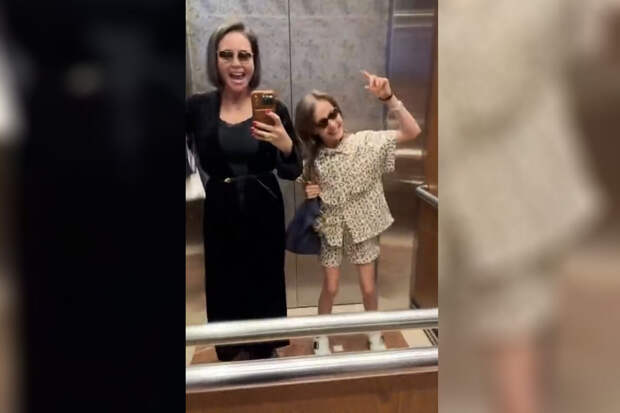 Ляйсан Утяшева и София были запечатлены в лифте. Телеведущая позировала в черном платье, бархатной накидке и солнцезащитных очках. Экс-гимнастка дополнила образ ремнем и сумкой.