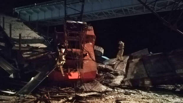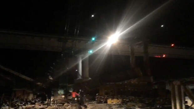 На опубликованном видеоролике запечатлены обломки перекрытий моста и рухнувшие с моста КамАЗ и строительный кран. Также на кадрах видна работа экстренных служб.