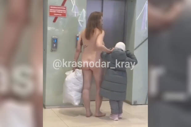 На опубликованном видео курянка абсолютно голая стоит у лифтов в торговом центре. В одной руке женщина держит свою одежду в пакете, за другую держится дочь.