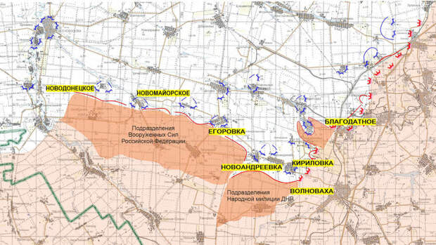 Группировка войск Донецкой Народной Республики (ДНР) при огневой поддержке российских ВС РФ вышла к населенным пунктам Новоандреевка, Кирилловка и Благодатное. Вооруженные Силы РФ продвинулись на 11 км и, продолжая наступление, вышли на рубеж Новодонецкое - Новомайорское - Егоровка. Об этом в ходе брифинга сообщил официальный представитель Минобороны России генерал-майор Игорь Конашенков.