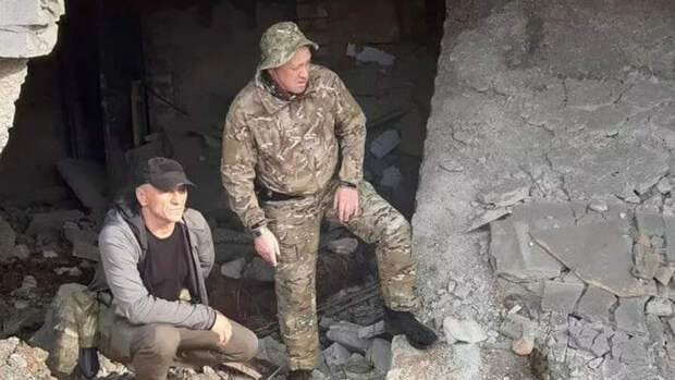 На опубликованном фото Богатов и Пригожин стоят на фоне полуразрушенного здания.
