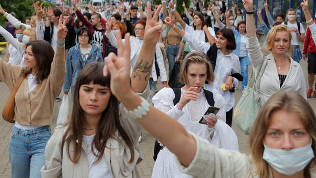 Ранее около 250 женщин в белой одежде с цветами вышли к Комаровскому рынку в Минске выразить протест против жестокости силовиков во время подавления акций протеста в стране после президентских выборов.