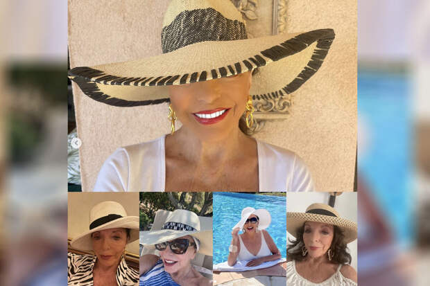 90-летняя Джоан Коллинз сделала коллаж из нескольких селфи, чтобы показать поклонникам свою коллекцию соломенных шляп. Практически на всех фотографиях актриса запечатлена в белой обтягивающей футболке, солнцезащитных очках и с красной помадой.