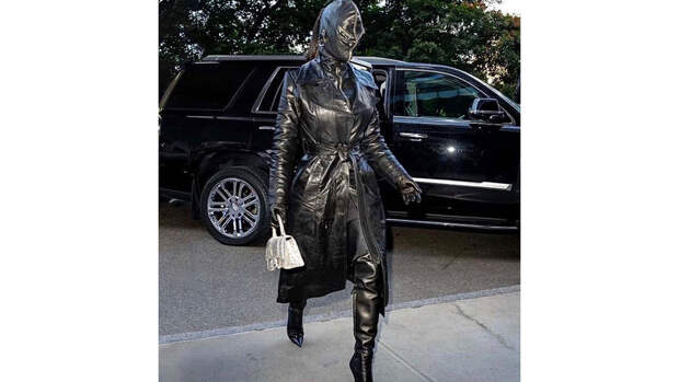 Также она надела черный кожаный плащ, высокие кожаные сапоги до середины бедра и перчатки.Отмечается, что балаклава Кардашьян напоминает маски ее бывшего супруга Канье Уэста, которые также скрывают все лицо.