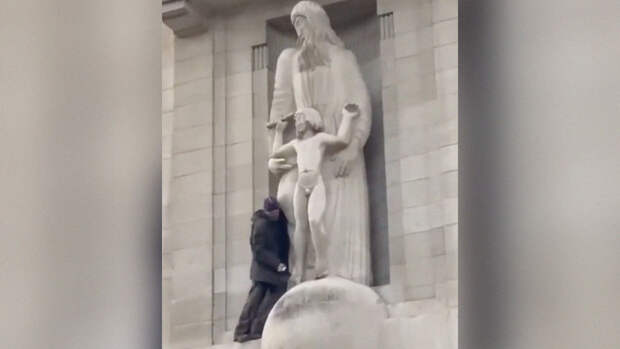 Мужчина взобрался на здание и разбивал статую молотком в течение четырех часов. Затем его удалось снять пожарным, полиция задержала мужчину.